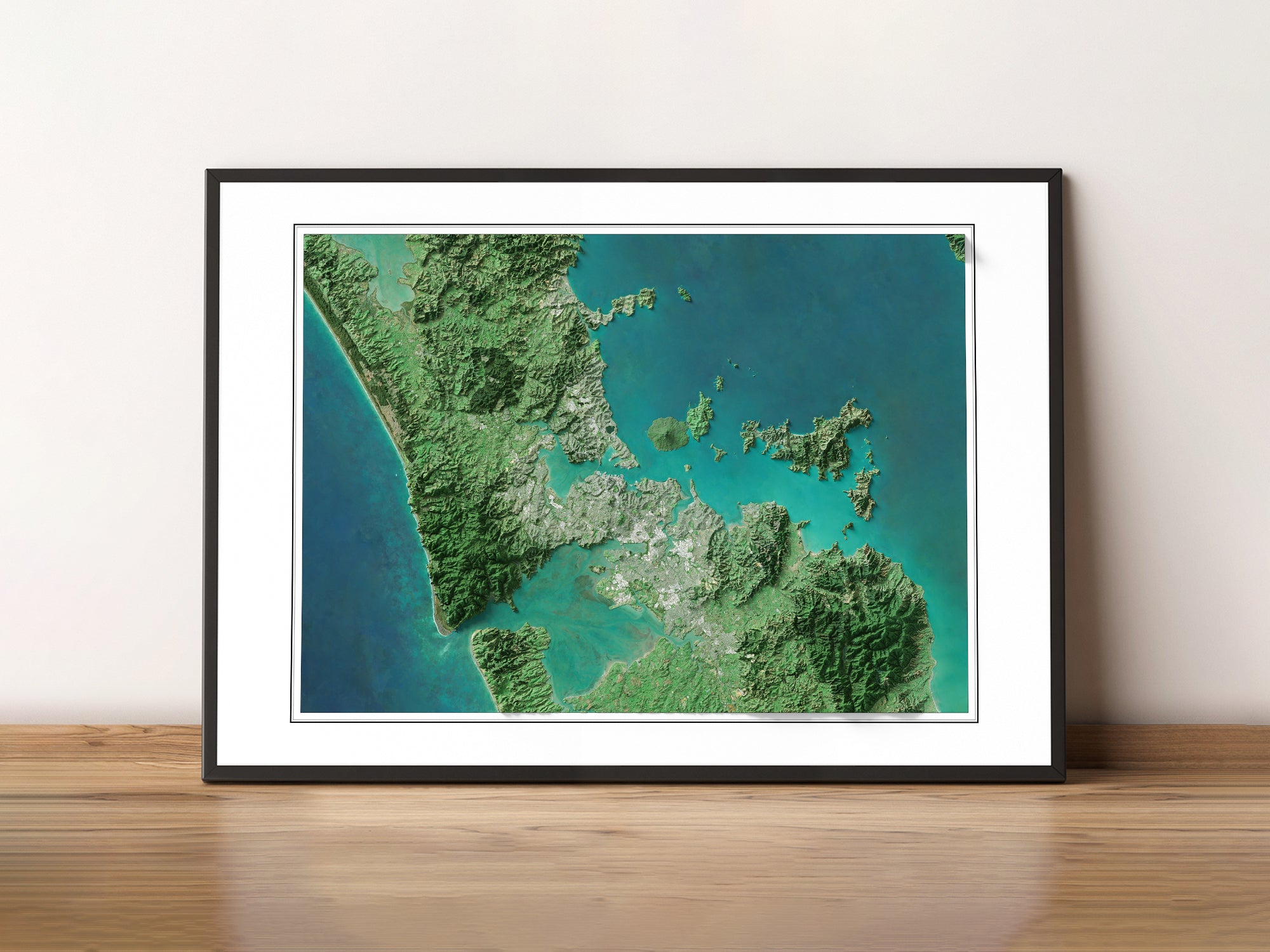 Shaded Relief Map of Auckland, New Zealand with satellite imagery.