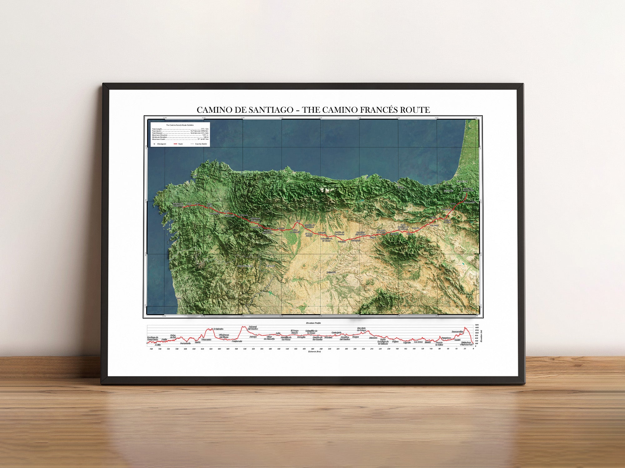 Includes the main stage points and route following the popular Camino Francés Route. An elevation profile is included with hike statistics. See your most memorable hike in a wall map like no other!