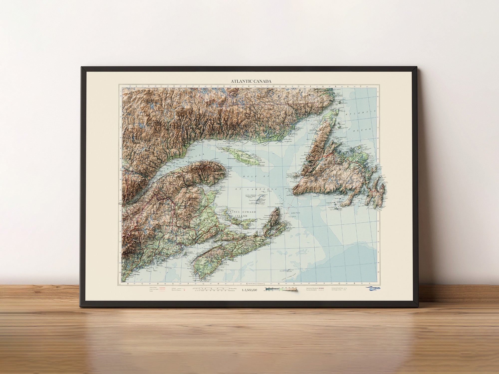 Vintage Topographic Map of Atlantic Canada. First Published in 1956 as part of the Times Atlas Series, we've restored and added Shaded Relief to create a beautiful representation of The Maritime Provinces and Newfoundland.