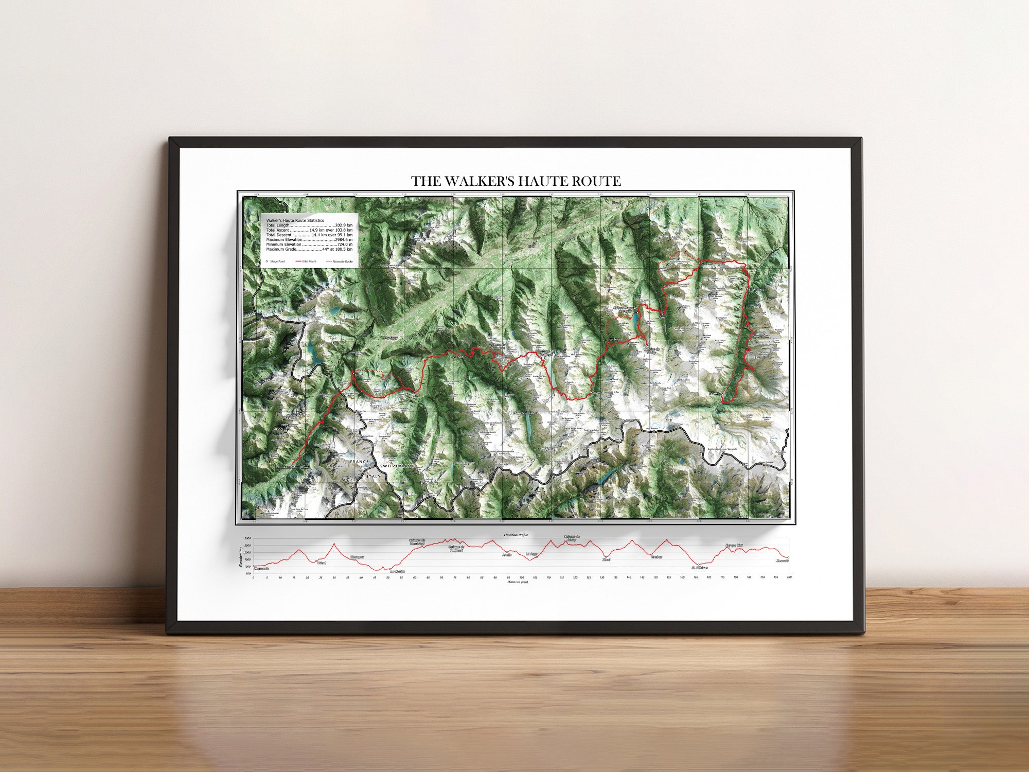 Map of The Walker's Haute Route Hike in France and Switzerland. Includes the main stage points and alternate routing. An elevation profile is included with hike statistics. See your most memorable hike in a wall map like no other!